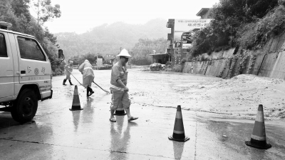 30日,仙游公路分局黨員搶險突擊人員冒著大雨在清理路面保暢通?!?/p>