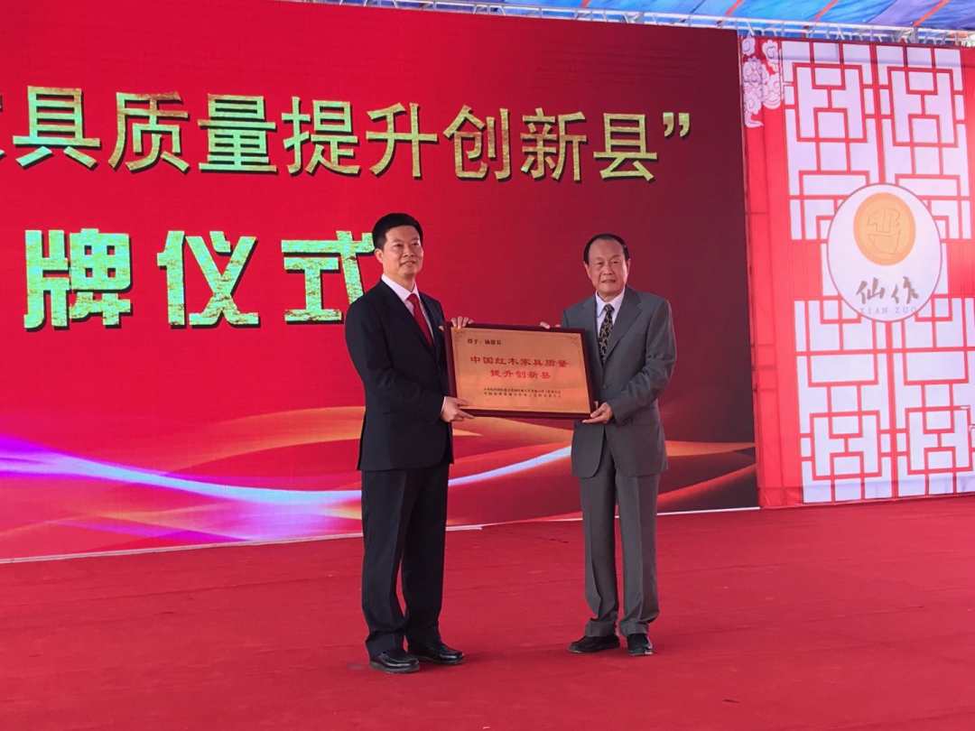 海峽藝雕城董事長黃元慶 開幕式上,原國務院稽查特派員、國資委國有企業(yè)監(jiān)事會原主席、中國產業(yè)發(fā)展促進會副會長、中科院中國傳統(tǒng)文化和傳統(tǒng)工藝發(fā)展工程委員會副主任孟憲剛向仙游縣人民政府縣長吳國順授牌,特授予仙游縣“中國紅木家具質量提升創(chuàng)新縣”榮譽稱號。