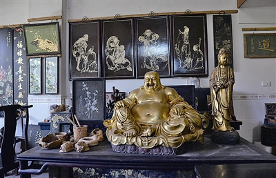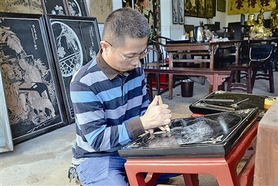 ① ② ③ 在賴店鎮土山村,有一戶人家,以祖輩相傳的漆刻手藝聞名鄉里,100多年來贏得了“漆芳世家”的美譽。今年43歲的傅宜鵬,就是這一珍貴民間技藝的第五代傳人。由他申報的“仙游傳統漆刻技藝”,入列莆田市第五批非物質文化遺產名錄。 記者走進傅宜鵬家中,空氣中散發生漆和木屑的芳香。其一樓、二樓的房間里,擺滿琳瑯滿目的漆刻精品。傅宜鵬巧手繪制下,這些工藝品披上了濃墨重彩的“外衣”, 仿佛賦予了新的內涵和生命,令第一次前來參觀的記者嘆為觀止。 在眾多的作品中,大廳中大型掛屏《天官賜?!纷钜俗⒛浚@是傅宜鵬選取3米長、1.5米寬的杉木,運用了多種技法,耗時2個月才完成。這幅作品講述著一個古老的故事,飄渺的白云、巍峨的群山,如玉帶環繞的江面,仙人從天而降,樵夫行走山間,漁夫舟上垂釣,書生松下吟對……甚至是花鳥魚蟲,都栩栩如生。 傅宜鵬回憶說,12歲起,他就跟著父親外出學藝,16歲出師,至今已30余年了。父親傅金清因為手藝出眾,還被同行們冠上“漆清”的藝名,附近鄉鎮無人不知。在上世紀八十年代,做漆曾是一門風光的好手藝,工錢高,引得不少年輕人拜師學藝。如今,傳統的土漆制作工藝不再盛行,漆匠也大多放下漆刷另尋謀生之法。 傅宜鵬介紹,傳統漆刻技藝種類很多,包括刻漆、漆畫、堆漆、脫胎、漆藝仿古等,工序十分復雜。單單以刻漆為例,要在先制作好的漆柸上臨摹各種山水、人物、花鳥等所需要圖案,并運用各種刀具雕刻,接下來,并根據畫面要求進行填色、貼金、撒屑,工藝流程可歸納為刻、鏟、批、作、貼、撒等6步。 “除了要有嫻熟的手藝,還要有懂得鑒別、制作上好的土漆?!备狄所i說,土漆就是漆樹上割下來的漆漿,也稱為生漆。生漆制作也是一個復雜的過程,要經過分選、過濾、晾制、曬漆、細濾等幾道工序。之后,根據作品本身需要的色彩,加入不同的礦物顏料來調配。 如今,當地已經很少有人種漆樹了,傅宜鵬是從外地買回原料,然后自行制作。作品上漆也受天氣影響,一般溫度28-30℃、濕度75%的情況下,生漆能夠自然風干。溫度高了蒸發快,就需要加油、加水;溫度低了,又需要保暖。雖然化學漆使用方便、價格低廉,但傅宜鵬認為,傳統的土漆具有獨特的魅力,比如耐溫、耐腐、耐磨、耐熱、隔水和絕緣性好、富有光澤等特性,最大的優點莫過于它的環保性。“沒有添加化學用品,不會對人體產生危害”。 近年來,根據市場需求,傅宜鵬還在仿古漆藝和漆器修復方面下功夫。“要修復一件古代的漆藝作品,首先要讀懂它,了解他的年代、構造和成分?!备狄所i說,這樣才能夠達到“修舊如舊”的目的?!拔沂且怨湃藶閹煟谄崞餍迯瓦^程中不斷研究古人的技藝,在此基礎上創新提升自己的惡作品”。 雖然耗工費時,還得靠天氣,技術含量高,但傅宜鵬一直堅守這門手藝。他說:“祖傳的手藝,要好好傳承下去,不能在我的手里失傳了。”漆刻技藝入選市級非遺,也讓他看到了希望,給堅持了一輩子的老手藝找個好歸宿。 圖①:傅宜鵬在創作中。 圖②:堆漆作品。 圖③:脫胎漆藝佛像。 |