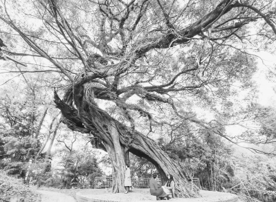 在仙游縣書峰鄉四黃村后境自然村,有一棵長成互相“牽手”的連理古榕,當地村民亦昵稱為“同心榕”。其樹齡古老、樹型獨特、冠幅高大,像只仰天長嘯的大象。 相傳古榕為北宋時所植,雖然樹干老態龍鐘、盤根錯節,但仍然身軀偉岸、生機勃勃,要18個人環抱才能將樹干圍住。枝干相抱處,形成了個拱門,拱門下可容納10個人。樹旁的石碑上刻著“千年古榕、重點保護”等字樣,還記錄著樹木的一些基本信息——樹高23米,冠幅呈橢圓形,胸圍17.5米。奇怪的是古榕上長出一棵荔枝樹。這棵荔枝樹照樣每年在花季開花,“荔花似海,滿樹異香”,但就是不結果。 |