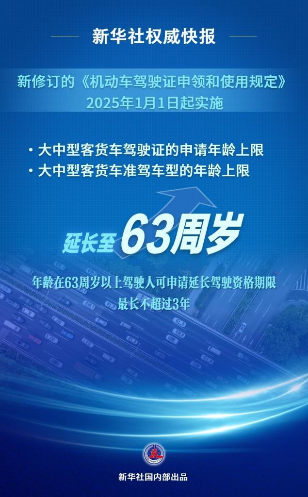 記者27日獲悉,公安部近日發布新修訂的《機動車駕駛證申領和使用規定》,重點調整延長大中型客貨車駕駛證的申請年齡和準駕年齡,積極保障群眾就業權益。修訂后的《機動車駕駛證申領和使用規定》將自2025年1月1日起實施。 修訂的主要內容,一是調整大中型客貨車駕駛證的申請年齡和準駕年齡上限規定,將大中型客貨車駕駛證的申請年齡上限由60周歲延長至63周歲,大中型客貨車準駕車型的年齡上限由60周歲延長至63周歲。二是明確大中型客貨車駕駛人申請延長駕車時間規定,年齡在63周歲以上需要繼續駕駛大中型客貨車的駕駛人,體檢合格和通過記憶力、判斷力、反應力等能力測試后,可以向車輛管理所申請延長原準駕車型駕駛資格期限,延長期限最長不超過3年。