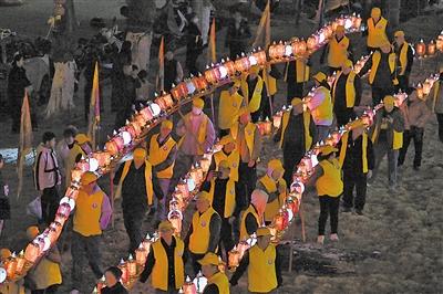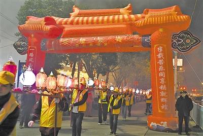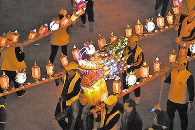 繞村巡游 2月6日晚,鯉城街道來洋社區熱鬧非凡,一條長長的“燈龍”穿梭于大街小巷,活龍活現,氣勢恢弘。 傍晚,家家戶戶扛出板凳燈在鳳堂宮組裝游燈,每架長約三米的板上點綴著五盞精巧的花燈,板凳燈首尾相接形成一條條“燈龍”。 “起!”眾人撐起板凳燈,在鳳堂宮前廣場進行“盤龍”儀式,“燈龍”以龍尾為圓心,龍身跟隨龍頭繞行,一圈復一圈形成旋圓,恍若龍盤,蔚為壯觀。 在龍頭燈的引領下,游燈隊伍經過來洋、木蘭、玉井、白塔等社區,行程10多公里,“燈龍”所到之處,鞭炮鼓樂齊鳴,場面熱鬧壯觀。村民紛紛在家門口迎接龍燈,以祈求國泰民安、風調雨順,家家安康。