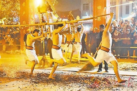 2月17日,涵江區白塘鎮鎮前村孝戶自然村舉行赤腳跑炭火元宵民俗活動。 當天16時50分,在興隆宮廣場外,柴垛被點燃,火光沖天而起。柴盡炭留,這些還冒著火星的炭塊被堆鋪在地上,成了此次活動的“跑道”。 20時40分許,興隆宮邊上的戲臺大幕拉開,唱起了莆仙戲。此時,24名青壯年換好服飾,繞著炭堆疾走。隨后,他們分成6組,抬起棕轎,赤腳穿行在炭火之上(如圖),往返數趟,火星四濺。記者了解到,當地赤腳跑炭火習俗,據稱與“蹈火助戰殲倭寇”有關,傳承戚家軍為莆田百姓赴湯蹈火、勇往直前的英雄氣概。 現場人山人海,游客和村民們的歡呼聲不時響起。來自遼寧沈陽的攝影愛好者呂軍,與朋友已在莆田停留10多天,深度探尋莆田元宵文化。他稱贊道,莆田元宵精彩紛呈,民俗文化豐富多樣,市民熱情好客,后勤服務保障周到,非常值得一來。他也通過鏡頭向朋友們大力宣傳莆田元宵文化。 來自河北保定的胡紅秋一家4口,特地來到莆田觀看元宵活動。胡紅秋說,第一次看到跑炭火,真的太震撼了!這種民俗活動蘊含著深厚的歷史底蘊,很有必要傳承下去。 來自北京的攝影愛好者王紅軍,同樣是慕名前來體驗莆田元宵文化。他表示,莆田元宵喜慶又熱鬧,跑炭火這一習俗尤為新奇。明年還會帶朋友一同來感受這般獨特的元宵氛圍。 |